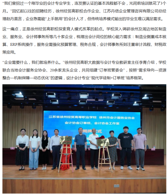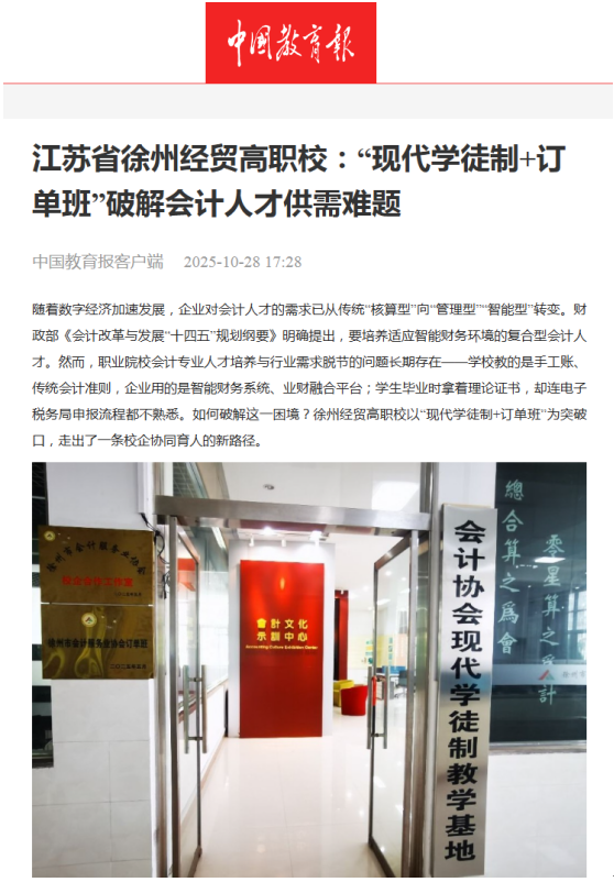 2025年10月28日,《中国教育报》客户端以《江苏省徐州经贸高职校:“现代学徒制 + 订单班” 破解会计人才供需难题》为题,专题报道了我校管理系在产教融合、校企协同育人方面的创新实践与显著成效。