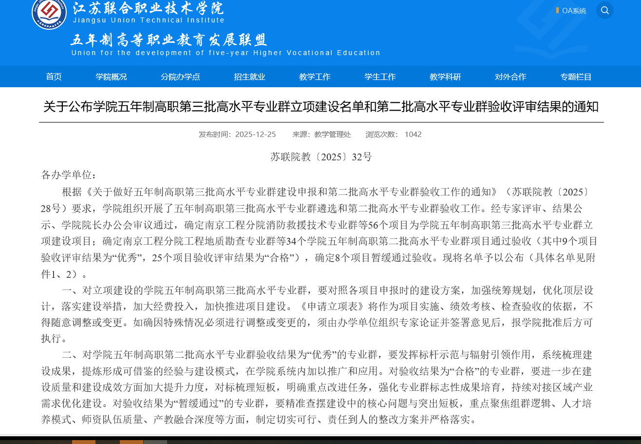 12月15日,江苏联合职业技术学院正式公布五年制高职第三批高水平专业群立项建设名单,由我系牵头申报的大数据与会计专业群成功入选,标志着系部专业建设与人才培养水平迈上新台阶。