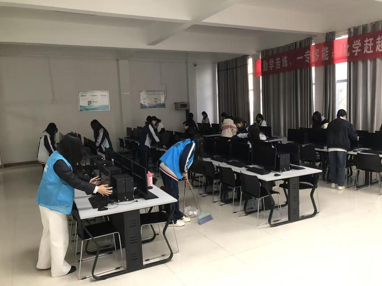 过程中,志愿者们展现出高涨的热情与责任感。志愿者们协作奋战,实训教室焕然一新——桌面光洁如新,地面干净无杂物,整体环境整洁明亮。实训楼管理员现场检查时,对教室清洁细节与志愿者的劳动态度给予高度认可。