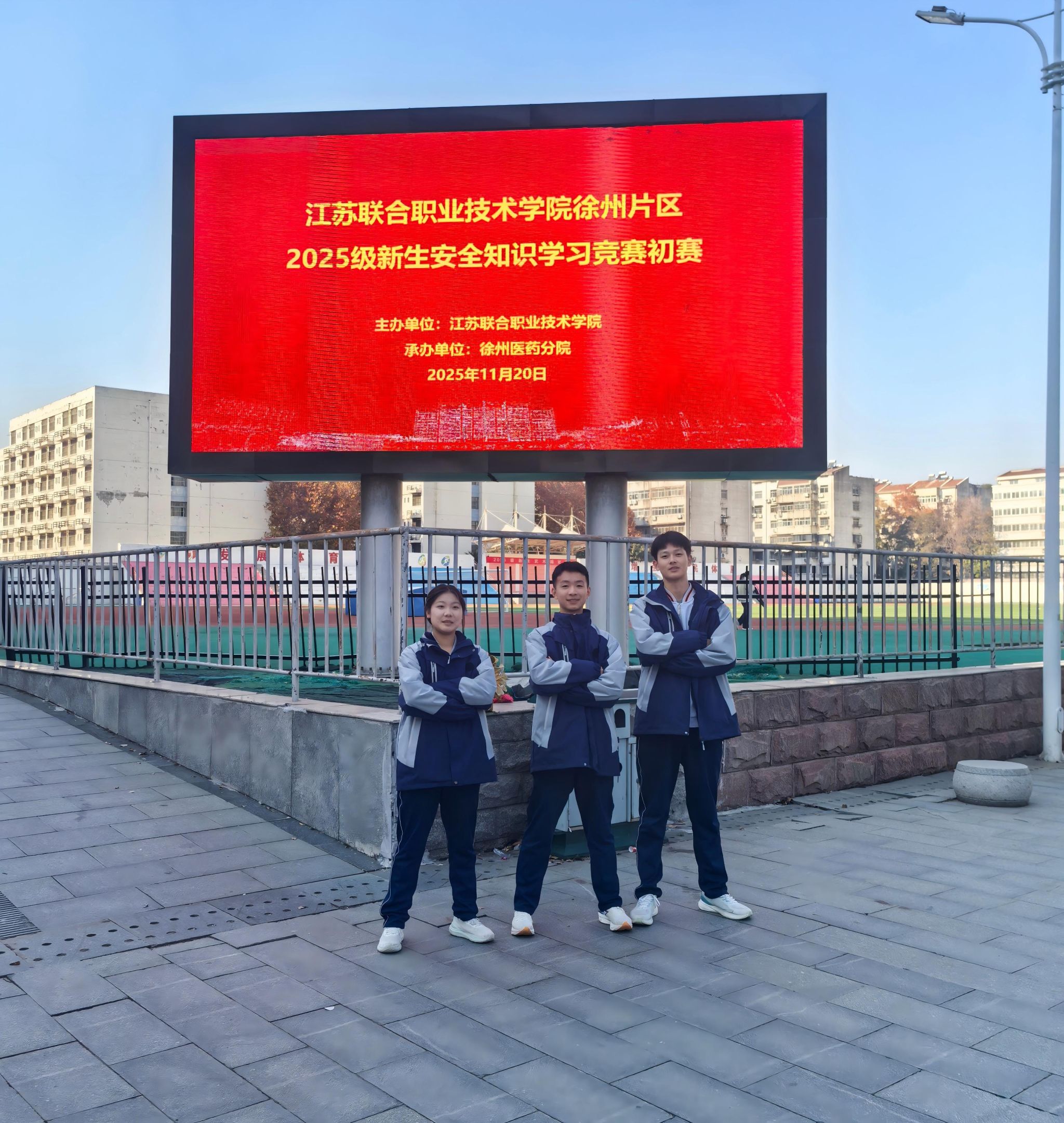 按《江苏省联合职业技术学院关于开展2025级新生安全知识学习竞赛的通知》(苏联院学[2025]10号)文件精神,学校于11月5日开始组织2025级高职新生参加活动,截止到11月20日0时,2025级高职学生共1129人全部通过课程学习和测评。同日,联院徐州片区工作组(徐州医药分院)下发《关于开展联院徐州片区2025级新生安全知识竞赛初赛的通知》,11月12日经保卫处、学工处共同筛选,选拔出会计高本251班赵俊伍、徐鸣、张韵涵三位同学,组建队伍参加初赛。经过8天的培训、训练,11月20日,孙峰、魏子栋带队前往徐州医药分院参加初赛,初赛项目包括线上答题和线下实操,经过激烈的角逐,我校代表队在徐州片区的十三支队伍中脱颖而出,以总分第一名的成绩荣获一等奖,顺利进入联院复赛。