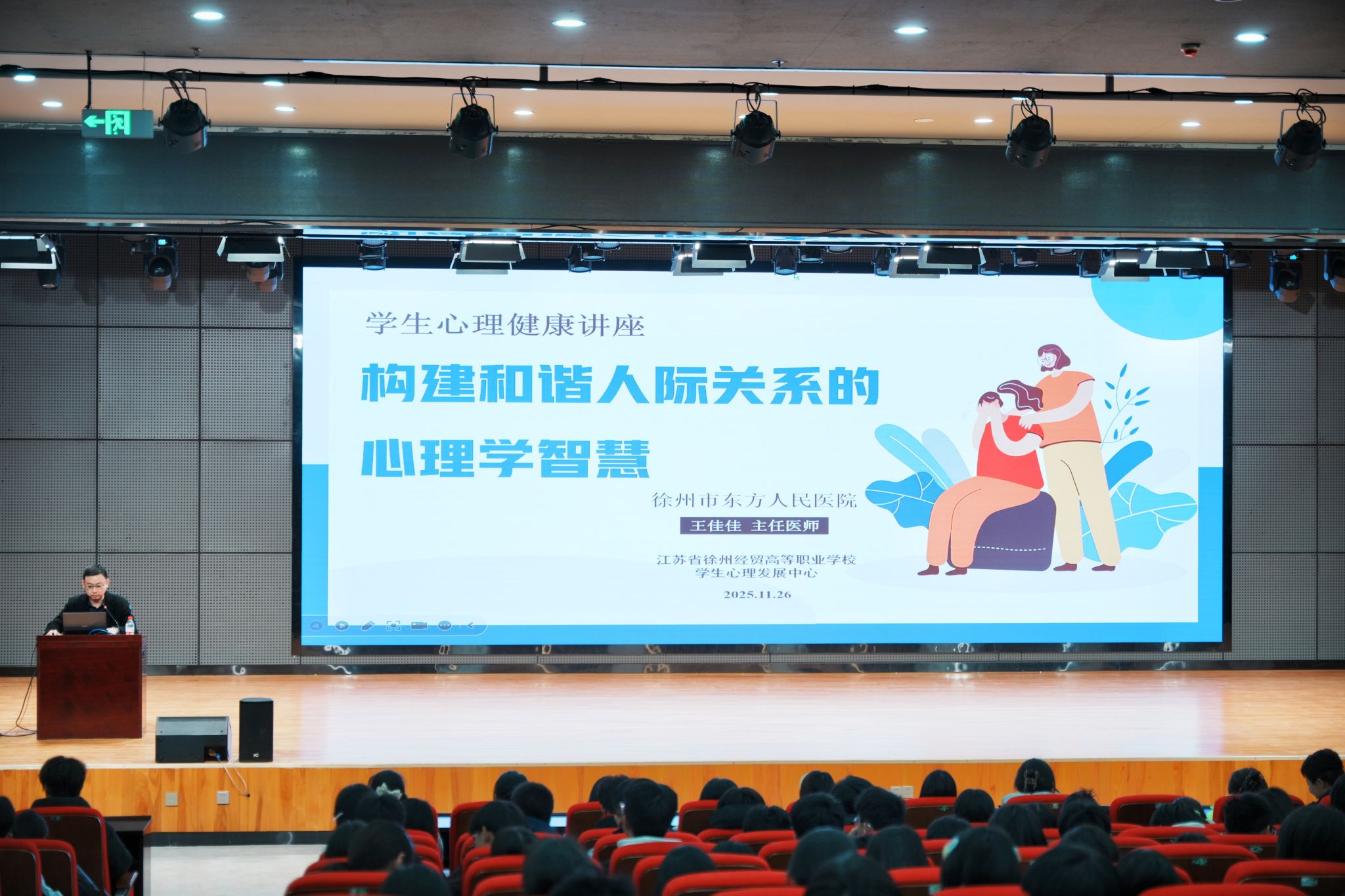 为全面提升我校学生心理健康素养,促进学生之间的良性互动与和谐人际关系的构建,营造积极健康的校园心理文化氛围,11月26日下午,我校特邀医校协同特聘心理专家、徐州市东方人民医院精神科的王佳佳主任,在学校报告厅为同学们带来了一场题为《构建和谐人际关系的心理学智慧》的精彩讲座。