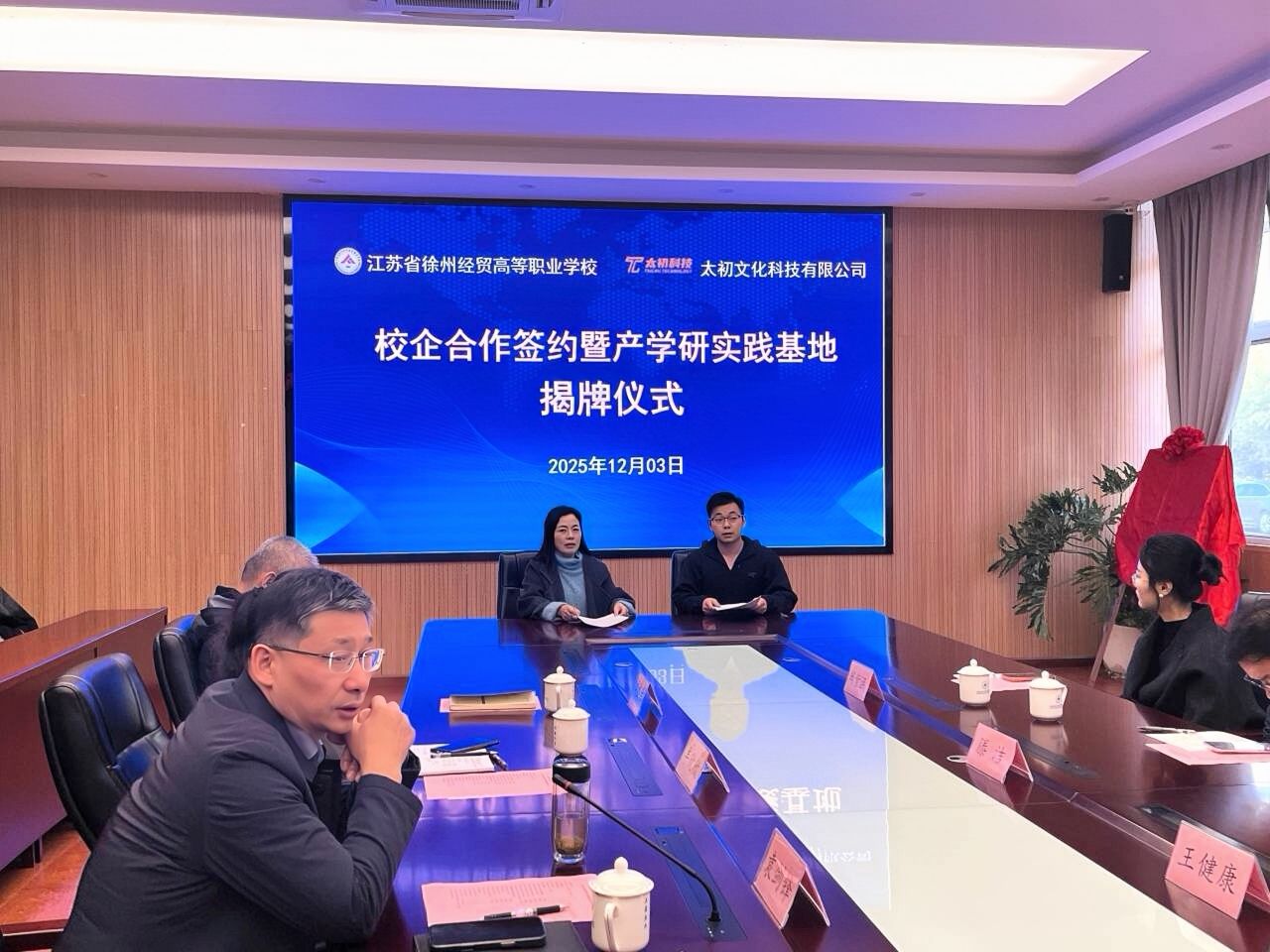 12月3日上午,学校与太初文化科技有限公司校企合作签约暨产学研实践基地揭牌仪式在智能会议室隆重举行。太初文化科技有限公司副董事长王健康、总经理程伟奇、副总经理滕洁等一行6人,我校党委委员、副校长袁剑锋,教务处处长丰欣欣、艺术设计系领导及部分师生代表共同出席仪式。仪式由艺术设计系主任杨春芳主持。