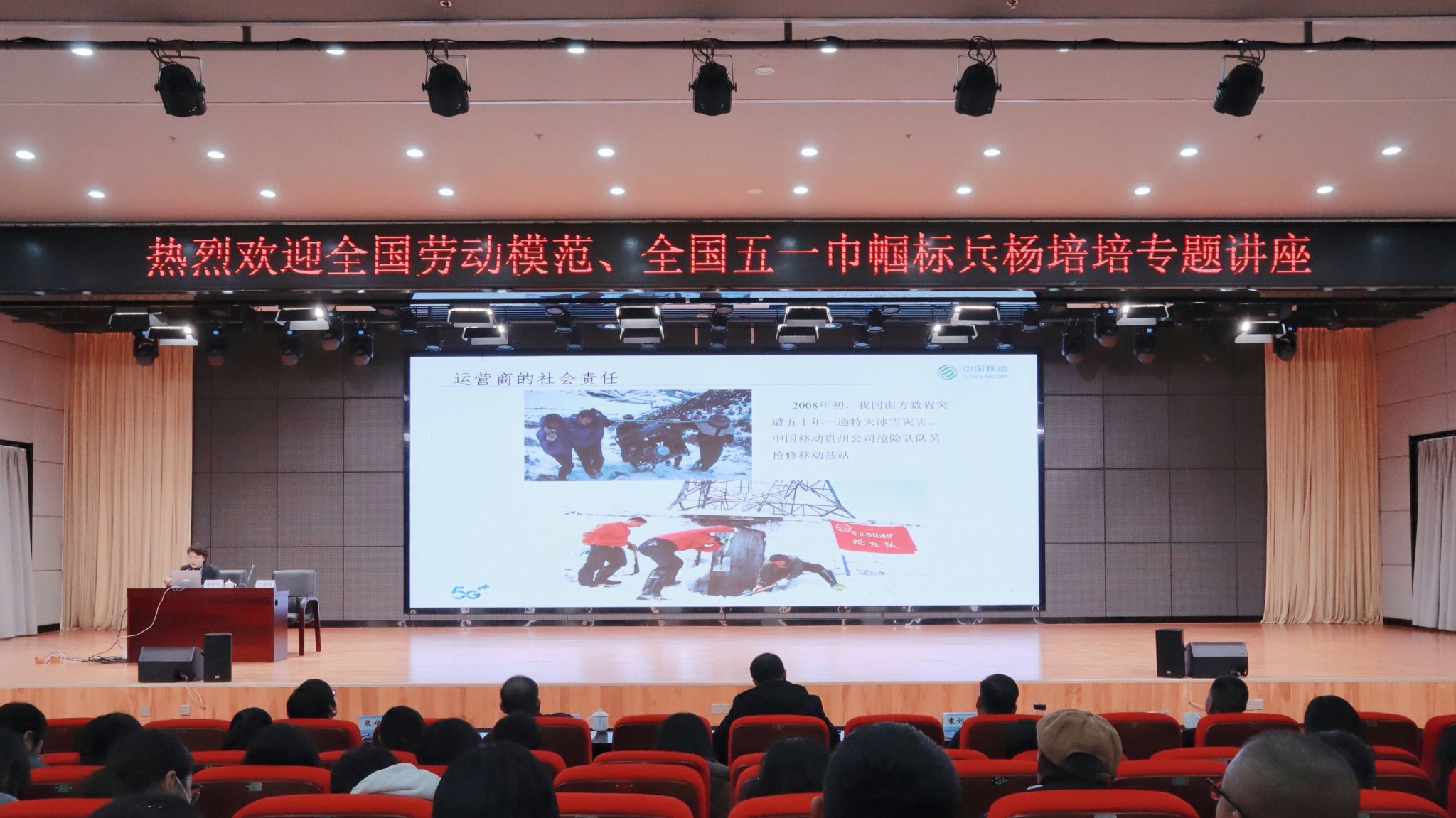 为弘扬劳模精神、劳动精神、工匠精神,全面加强教职工思想政治引领,在学生中营造劳动光荣、技能成才的浓厚氛围,12月4日下午,我校“蟠桃山大讲堂——全国劳模讲座”在学校学术报告厅举行。活动邀请全国劳动模范、全国五一巾帼标兵、中国移动徐州分公司政企客户部经理杨培培作专题讲座。学校领导班子全体成员出席活动,校长助理、工会主席丁会兵主持,师生代表约500人到场聆听。