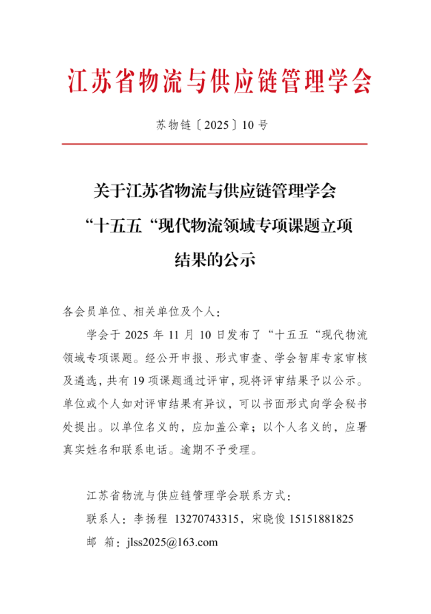 江苏省物流与供应链管理学会作为省内物流领域的重要学术团体,始终致力于推动物流与供应链管理理论研究和实践创新,其立项课题代表了省内该领域研究的前沿方向和重点需求。此次我校教师课题成功入选,充分彰显了专业老师在现代物流研究领域的专业实力与学术水平。
