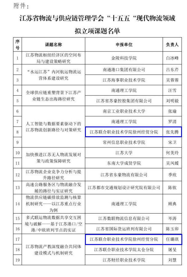 近日,江苏省物流与供应链管理学会公布了“十五五”现代物流领域立项课题名单,我校商贸系张先腾、任璐琪两位老师主持的课题从数百项选题中脱颖而出,成功获批立项,这是我校在物流供应链管理与产教融合共同体建设领域科研工作的又一重要成果。