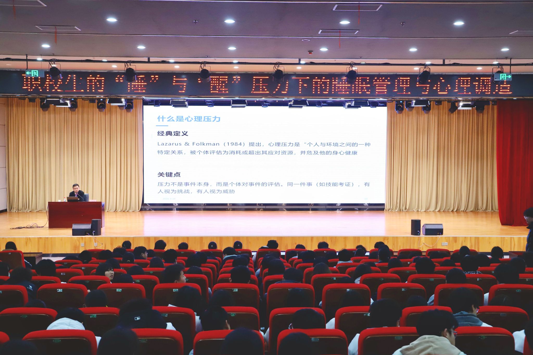 为深入贯彻落实国家教育部关于全面推进健康学校建设的意见,切实加强中高职学生心理健康教育工作,引导学生科学应对压力,提升睡眠质量与心理调适能力,在2026年“320咱爱您”心理健康周暨“321世界睡眠日”来临之际,由我校学生心理发展中心主办的《职校生的“睡”与“醒”——压力下的睡眠管理与心理调适》专题讲座在学校报告厅顺利举行。本次讲座特邀徐州市东方人民医院精神科主任王佳佳担任主讲嘉宾。活动由学生心理发展中心负责人周雯主持,全校学生通过线下主会场与线上直播相结合的方式共同参与。