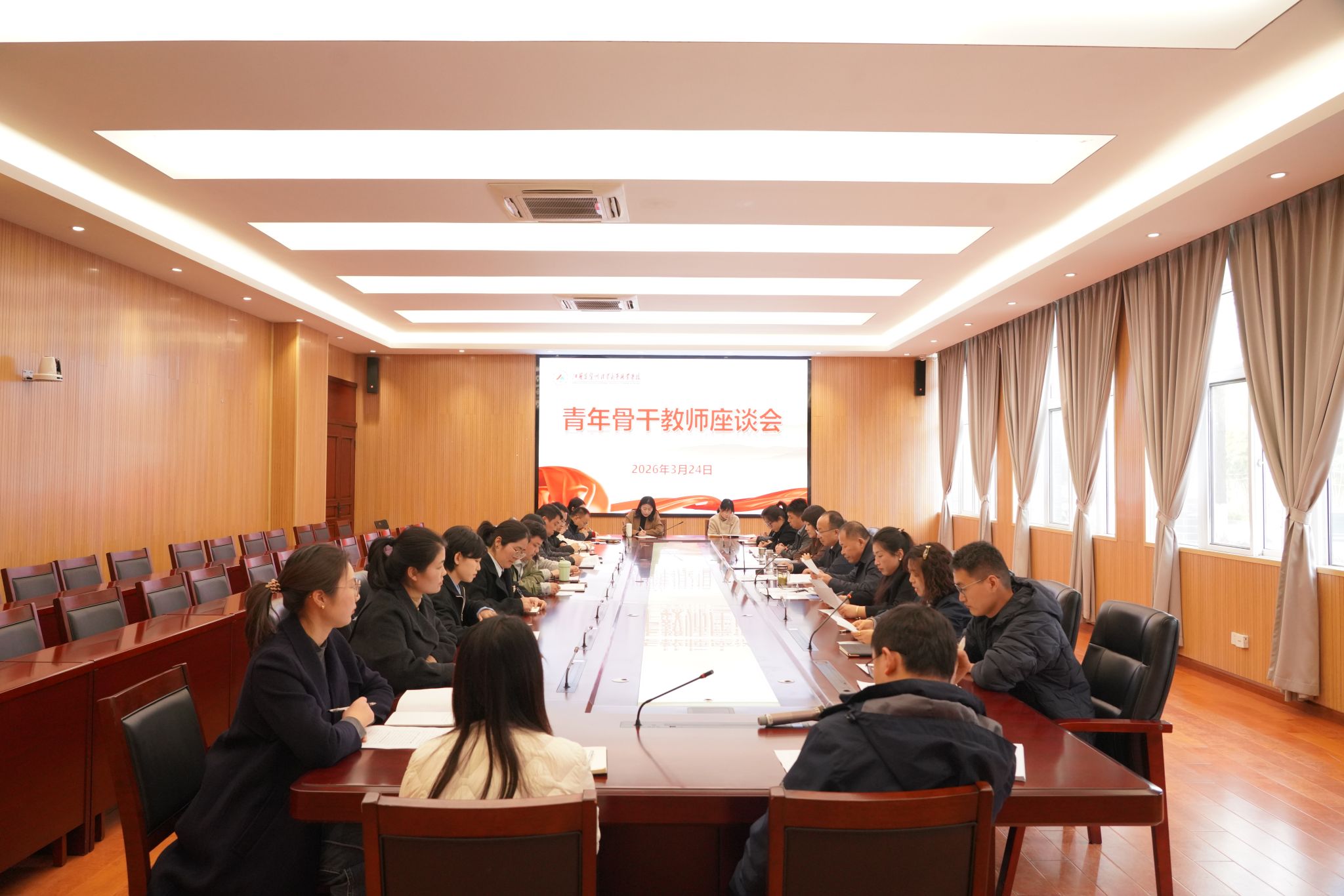 为深入贯彻《教育部关于深化职业教育教学关键要素改革的意见》(职教成【2026】1号)文件精神,助力青年教师专业成长,凝聚学校高质量发展的青春动能,3月24日下午,我校在智能会议室召开青年骨干教师座谈会。学校党委书记、校长刘芳铭,党委委员、副校长杨政出席会议并讲话,会议由组织人事处负责人主持。21名青年教师代表参会交流。