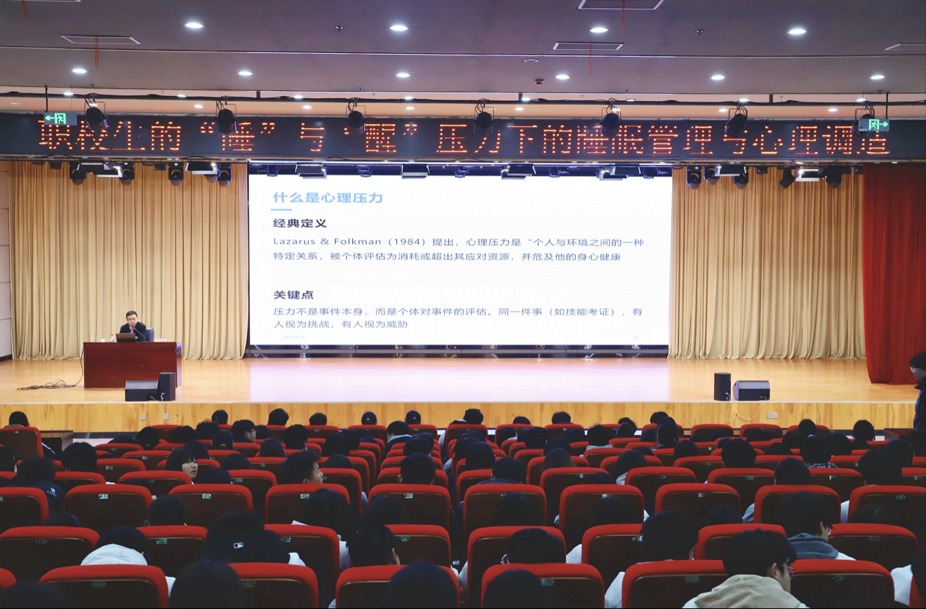 结合“3·21世界睡眠日”这一重要节点,心理发展中心特邀医院精神科专家走进校园,为同学们带来了一场主题为《职校生的“睡”与“醒”——睡眠管理与心理调适》的专题讲座。专家从睡眠的生理机制讲起,结合职校生常见的熬夜、作息紊乱、睡眠焦虑等问题,深入浅出地分析了睡眠与心理健康的密切关联,并现场教授了认知调整等实用技巧。同学们纷纷表示“原来睡个好觉也是一门学问”,对科学管理睡眠、调节情绪有了更清晰的认识。
