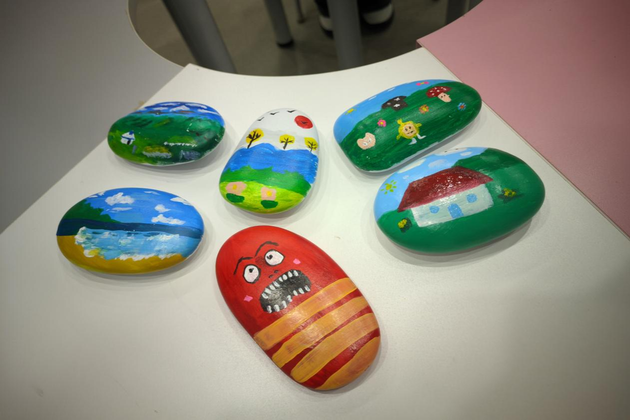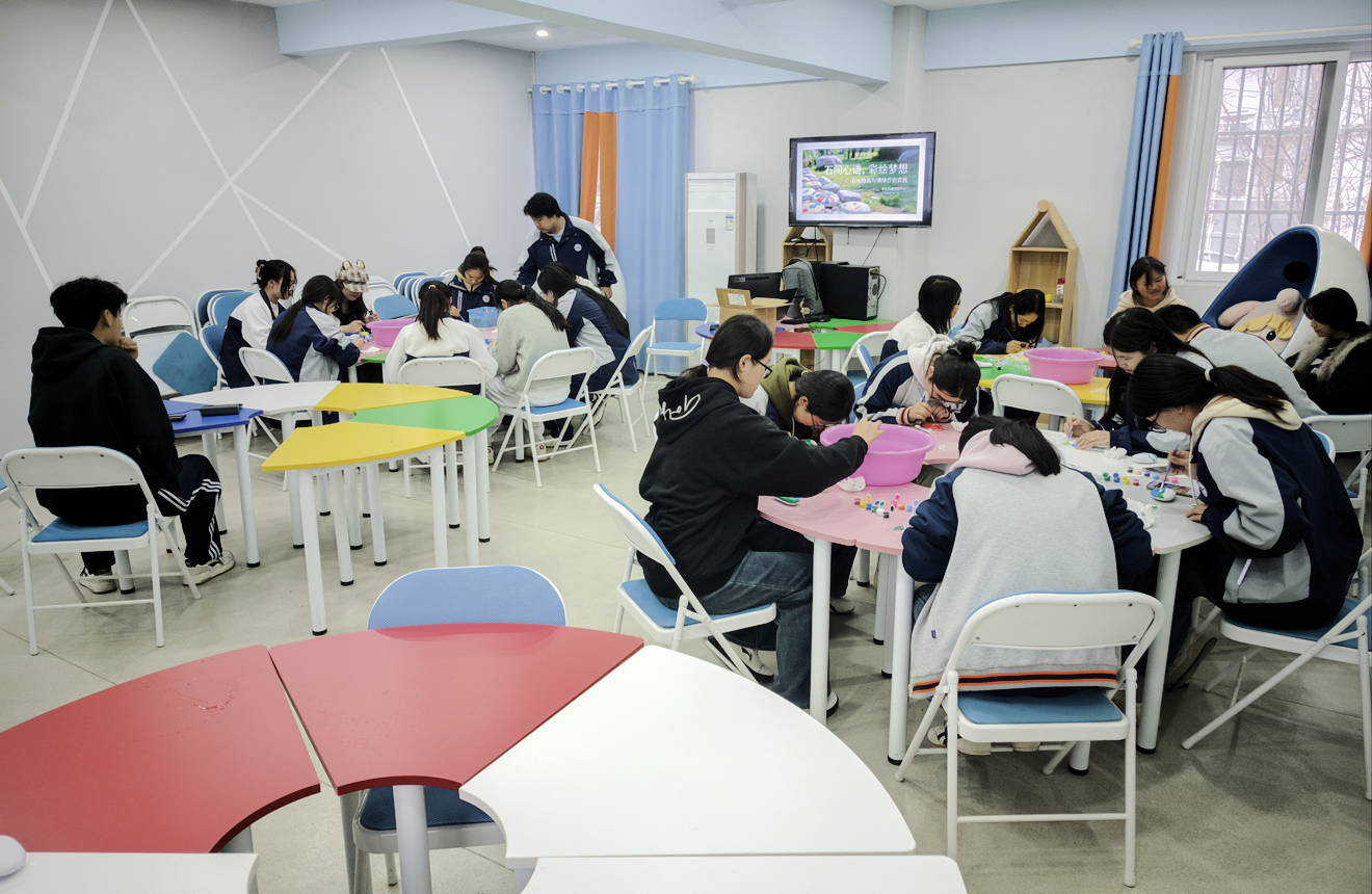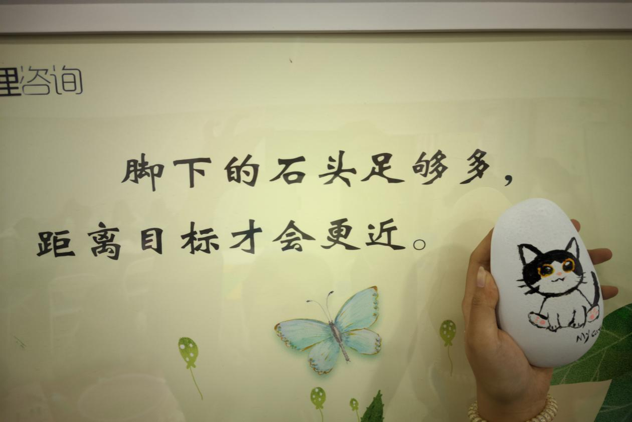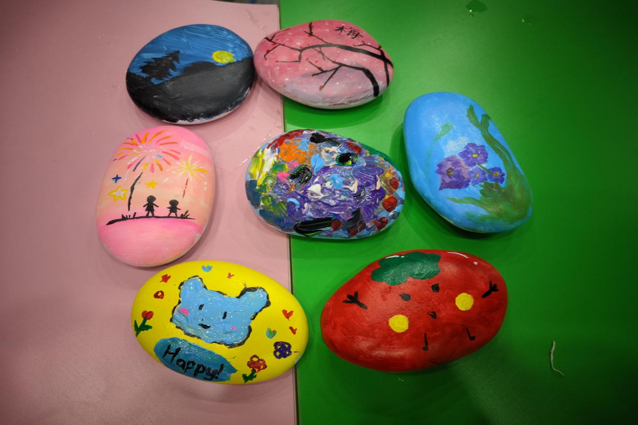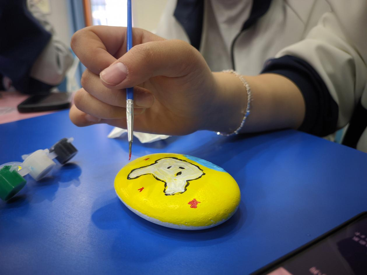 作为本次系列活动的亮点之一,“石头画”创作体验吸引了众多学生踊跃参与。在安静的创作空间中,同学们挑选形态各异的空白石头,以画笔为媒,在方寸之间尽情涂绘。有人画出灿烂的向日葵,有人描摹静谧的星空,也有人用抽象的线条表达内心的情绪起伏。沉浸式的创作过程让同学们暂时放下学业与生活的压力,在色彩与线条的交融中回归内心的平静。一位参与活动的同学感慨道:“画石头的时候,整个人都静下来了,好像把心里的烦恼也一笔一笔画出去了。”