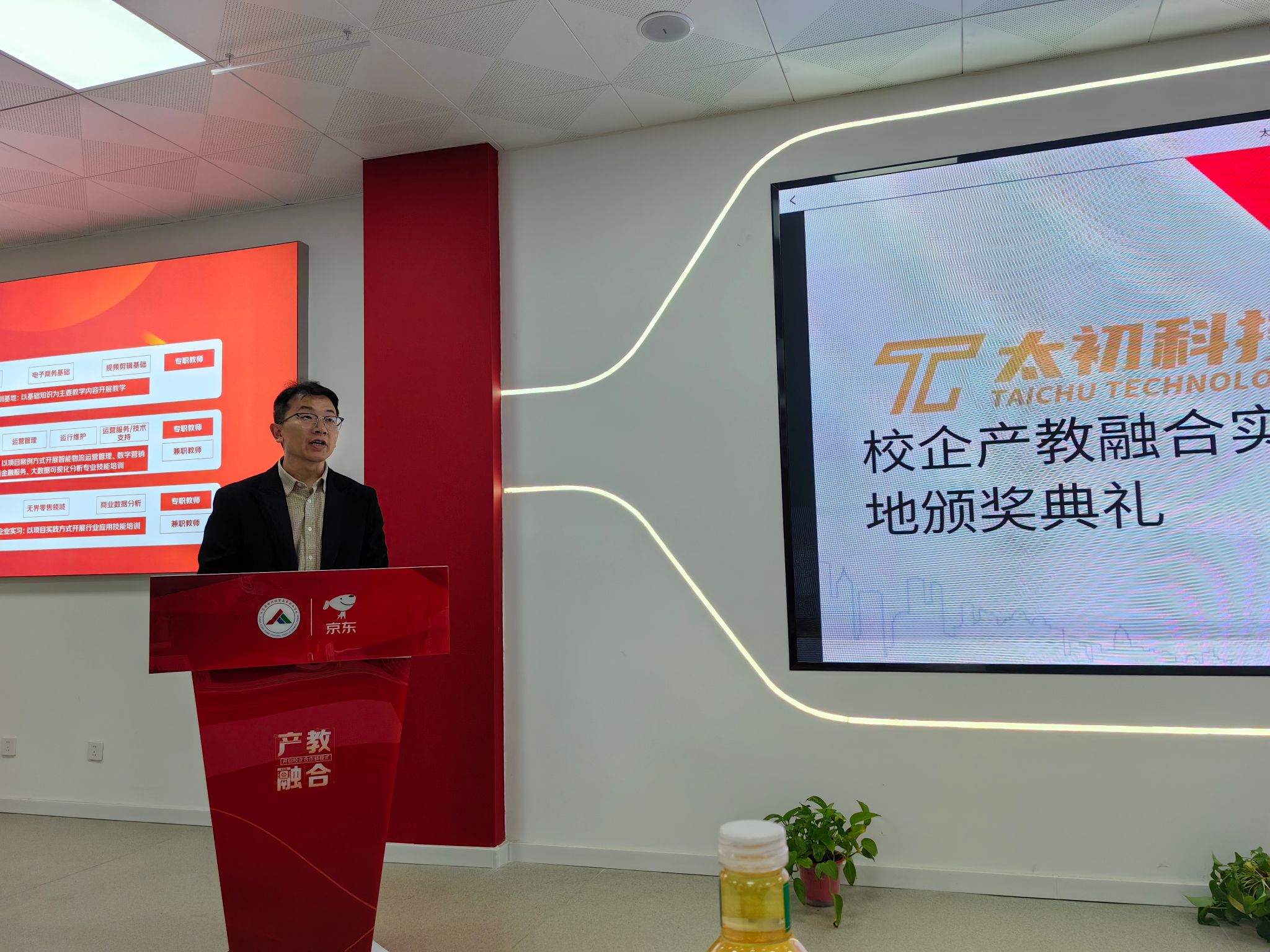 袁剑锋代表校方发表了重要讲话。对太初科技为学生提供优质实习实训机会和平台表示感谢,并对直播获奖学生表示热烈祝贺。他高度评价了该项目在提升学生直播实践能力、促进理论知识与产业需求对接方面发挥的重要作用。他指出,此次颁奖典礼是校企双方深化合作、共育人才的重要里程碑,学校将继续支持并推动此类产教融合项目,探索更多元化的合作模式,共同培养适应经济社会发展需要的高素质人才。