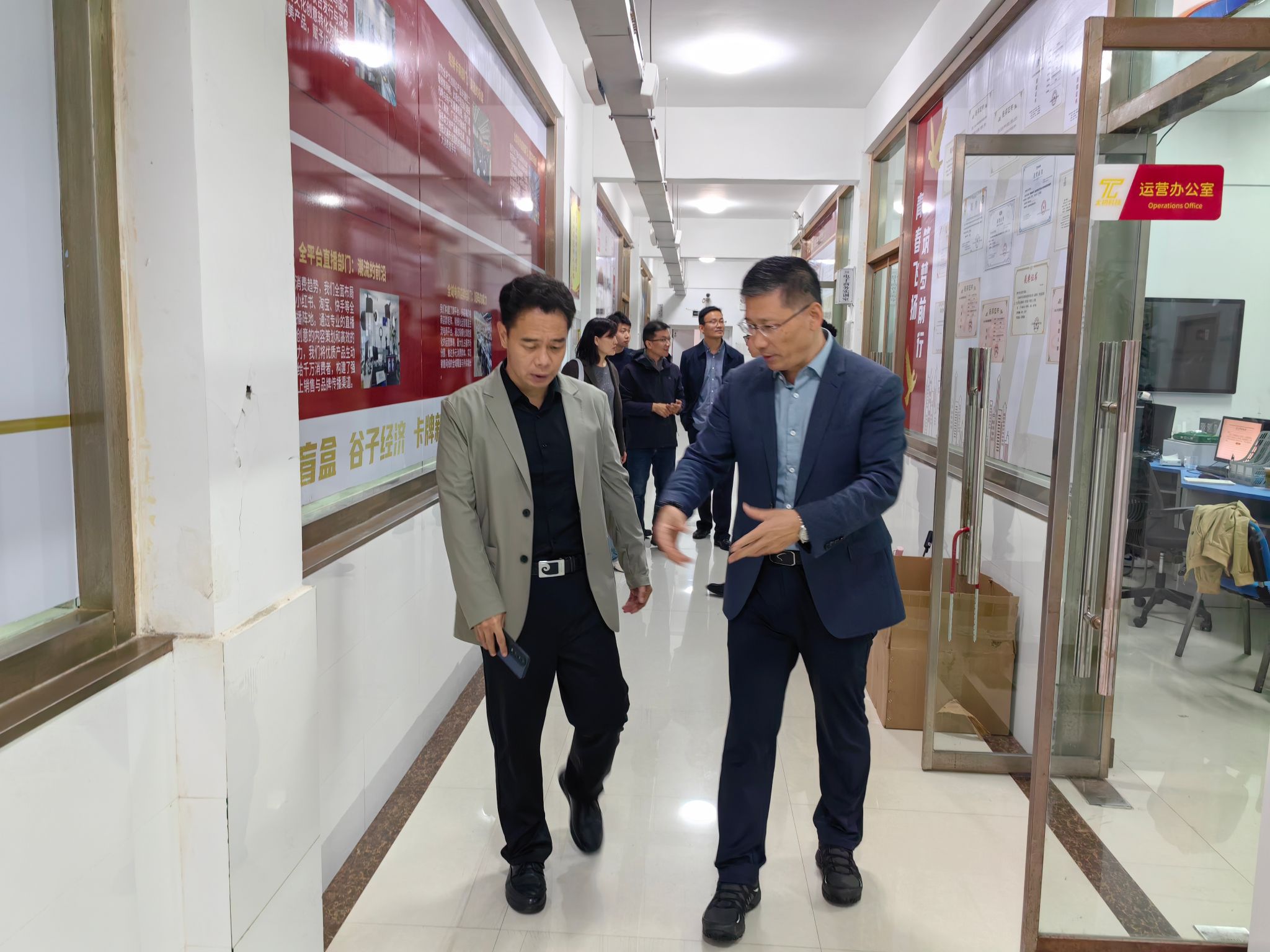 黄院长一行参观了国家级虚拟仿真实训基地、青春电商谷、太初科技产教融合直播基地,与太初科技企业几位领导进行了深入交流,对我系引进企业真实项目,深化产教融合,改进教学模式,提高学生实践能力,实现了人才链与产业链无缝对接、课堂与工厂的无缝衔接的做法给与了高度评价和赞许。